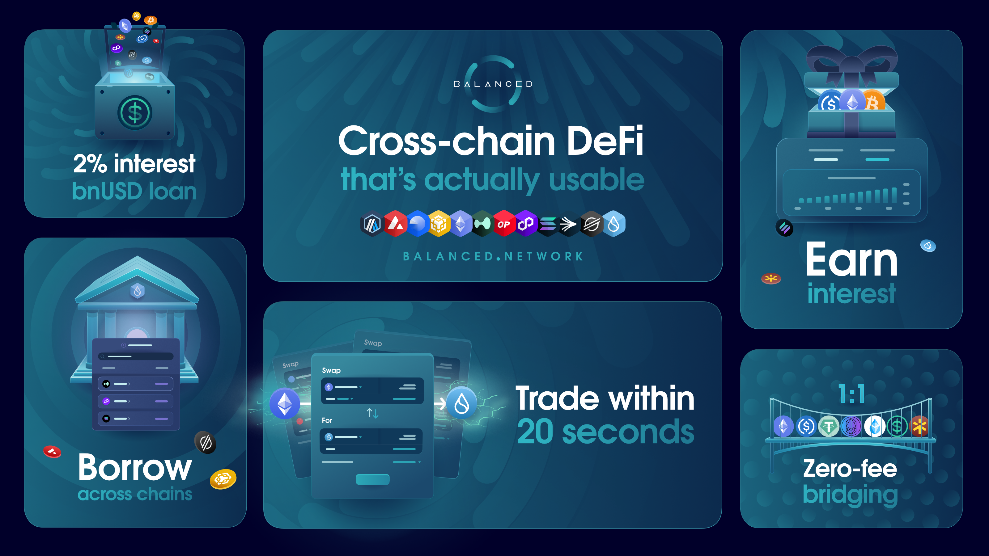 You can use Balanced v2 to trade across 12 blockchains within 20 seconds, transfer the same asset between chains for free, supply crypto to the money market to earn interest, and borrow crypto from other chains.